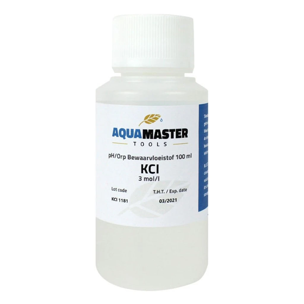 Aqua Master KCI Storage Solution. Traceable to NIST standard. Close immediately after use. Store between 59-77°F (15-25°C). Do not return liquid. Thoroughly rinse the electrode before and after each use. Pour some KCI storage solution into the electrode’s protective cover. Place the electrode in the solution.