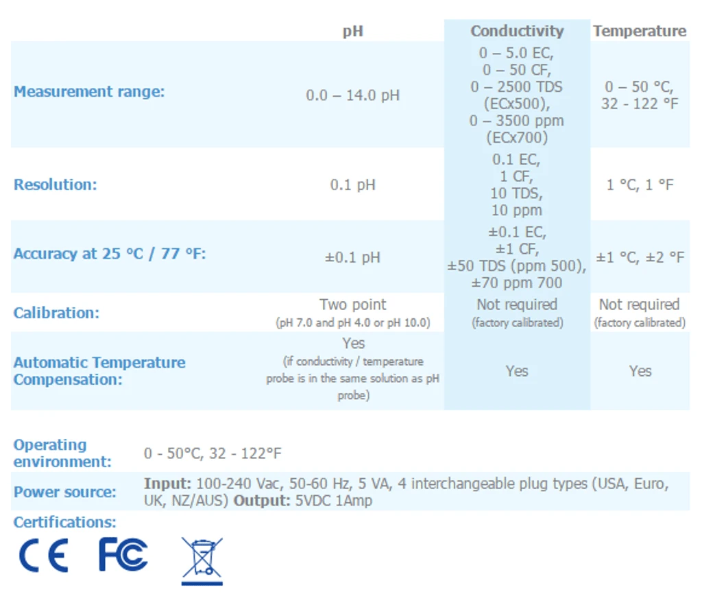 - Selectable values for conductivity and temperature
