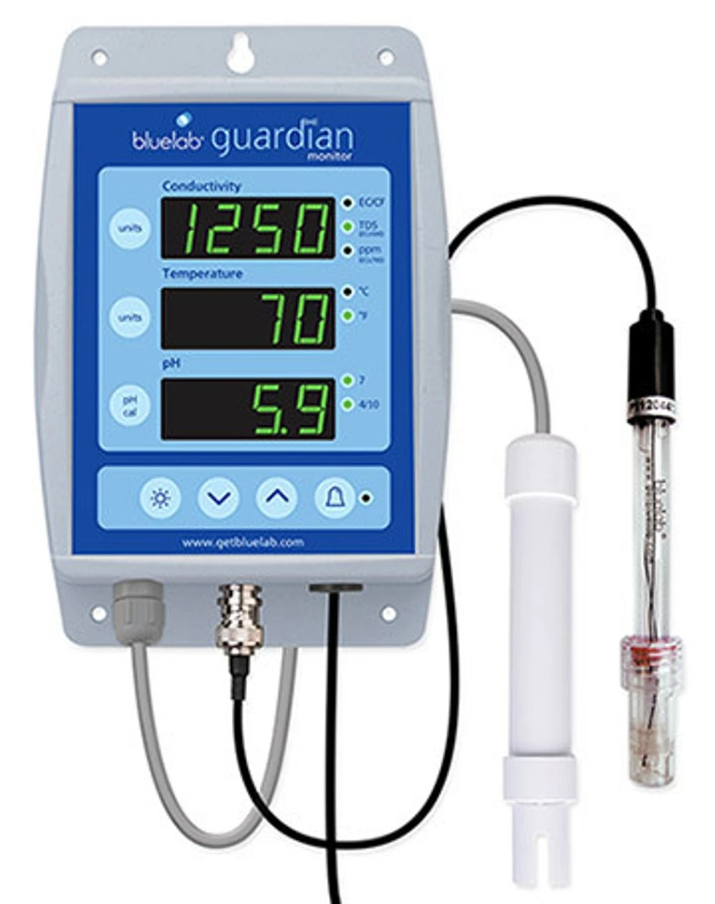 Luckily, this doesn’t have to be a concern if you use the Bluelab Guardian Monitor. It can be mounted on a wall or hung by a support bar for easy monitoring. When you setup your reservoir, simply place the probes in the solution and adjust as needed. Gone are the days of constantly coming to the grow room and manually testing your nutrient solution!