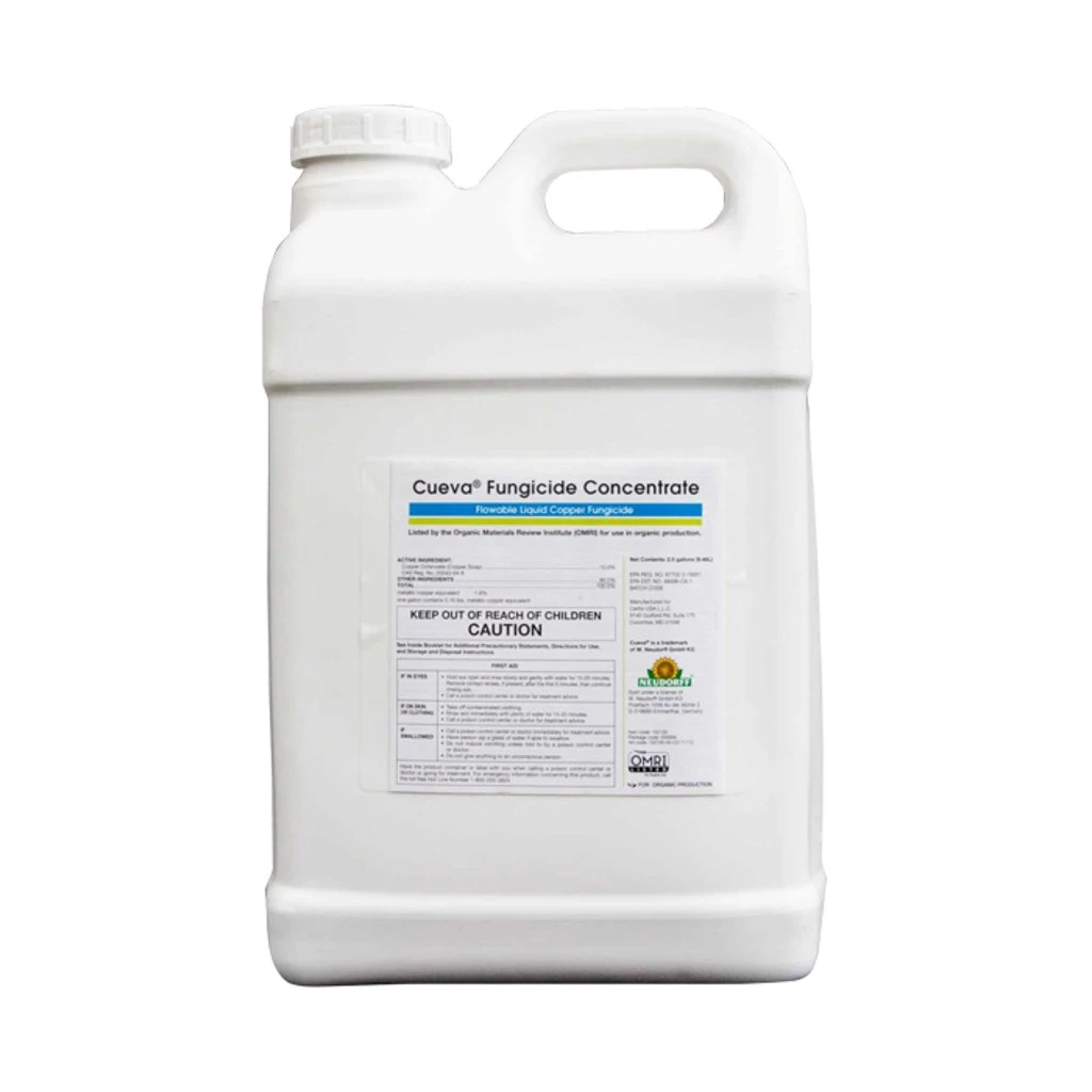 Fixed copper has long been coveted as an excellent broad spectrum fungicide and bactericide. Cueva brings this age-old ingredient up to date with this patented flowable liquid formulation. Organic Cueva combines a soluble copper fertilizer with a fatty acid to create a true soap. The fatty acid basis of this formula works two ways: to help the active ingredient of copper get into the fungal or bacterial cells and by helping spread the material across plant surfaces. Once the copper itself is in the pathogenic cells, it will denature the cells and cause fatal cell leakage. As Cueva moves across the plants and into the cells, it helps protect the plants from potential or further damage by creating a hostile environment for infection or re-infection.