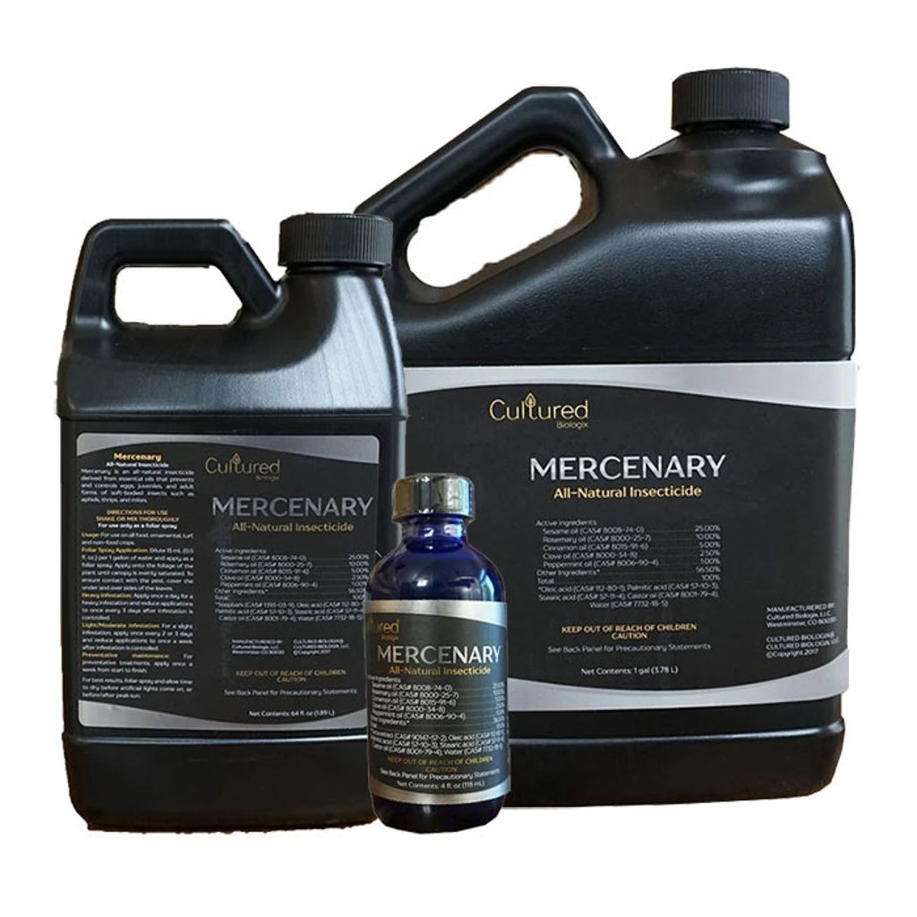 Mercenary is an all-natural insecticide derived from essential oils that prevents and controls eggs, juveniles, and adult forms of soft-bodied insects. These insecticidal oils are combined with proprietary emulsifiers and surfactants for enhanced water-to-oil bonding, spreadability, and effectiveness against the target pests.