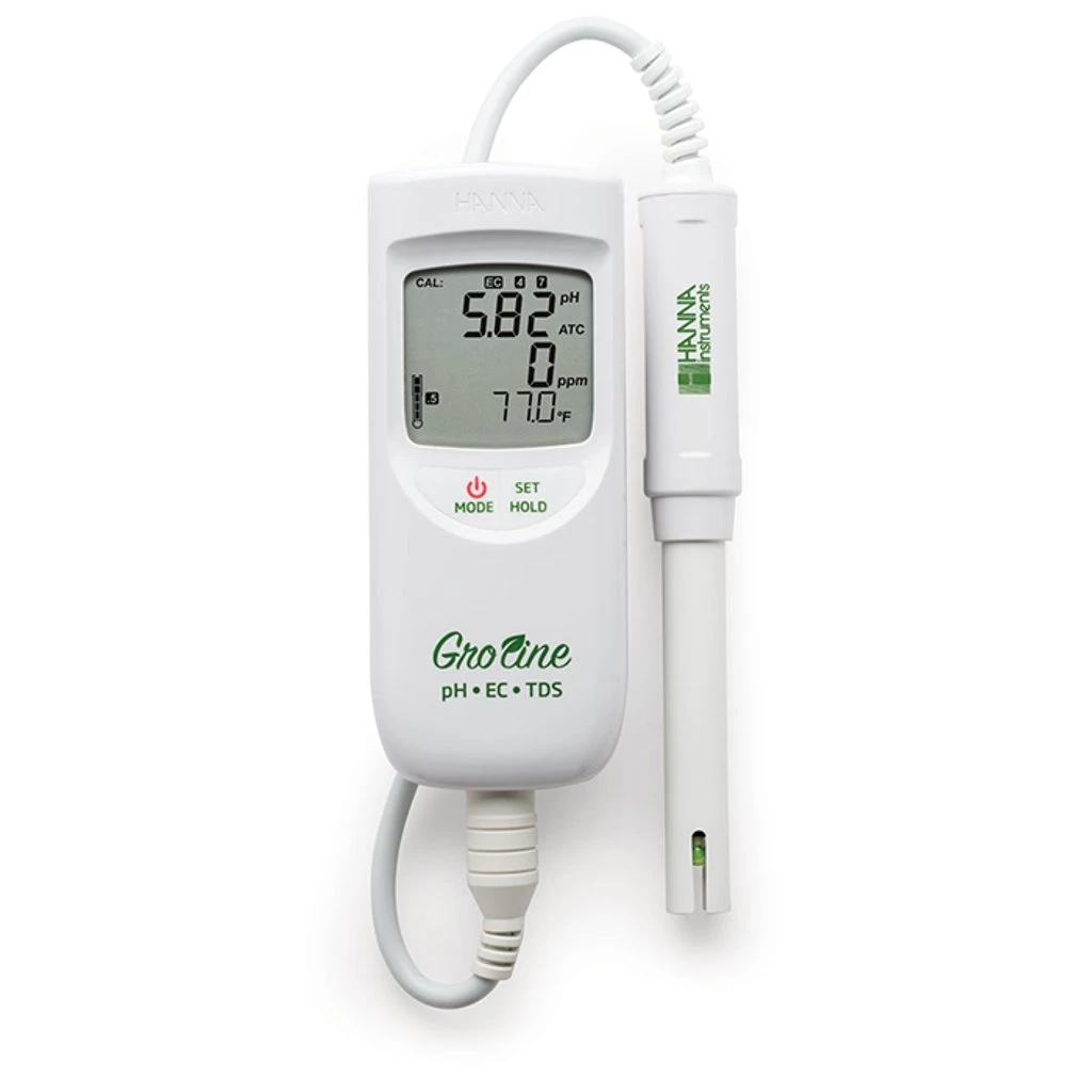 The Hanna Instruments GroLine Portable Waterproof pH/EC/TDS Meter is designed for hydroponic, aquaponic, and greenhouse growers.