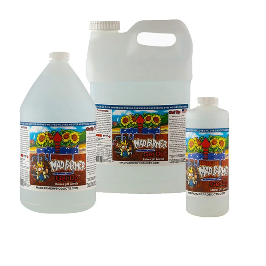 The Mad Farmer’s Get Up is proudly made in the USA and is specifically designed to raise the pH levels of liquid nutrient solutions. It is compatible with all brands of nutrients, organic and/or synthetic. The Mad Farmer’s Get Up contains only the finest ingredients. No dyes are added to mask the quality and clarity of his formula. Get Up contains three different pH alkalizing agents, which optimizes it’s strength and stability. Check pH levels daily and make any necessary adjustments. The amount needed will vary. Use Mad Farmer’s NUTS to stabilize pH fluctuation.
