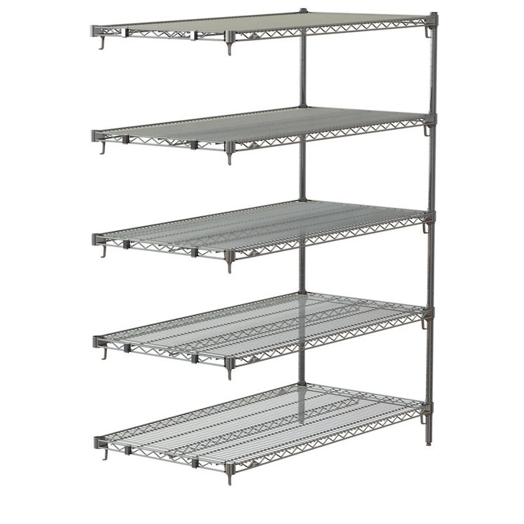The five shelves feature a unique corner release system that allows them to be adjusted quickly and easily without the use of tools, while an open-wire construction minimizes dust accumulation to permit free air circulation and greater visibility. The Super Adjustable 2 chrome shelves each have an 800 lb. capacity to hold your heaviest prep tools or bulk ingredients and the entire add on unit has a 2000 lb. maximum capacity.