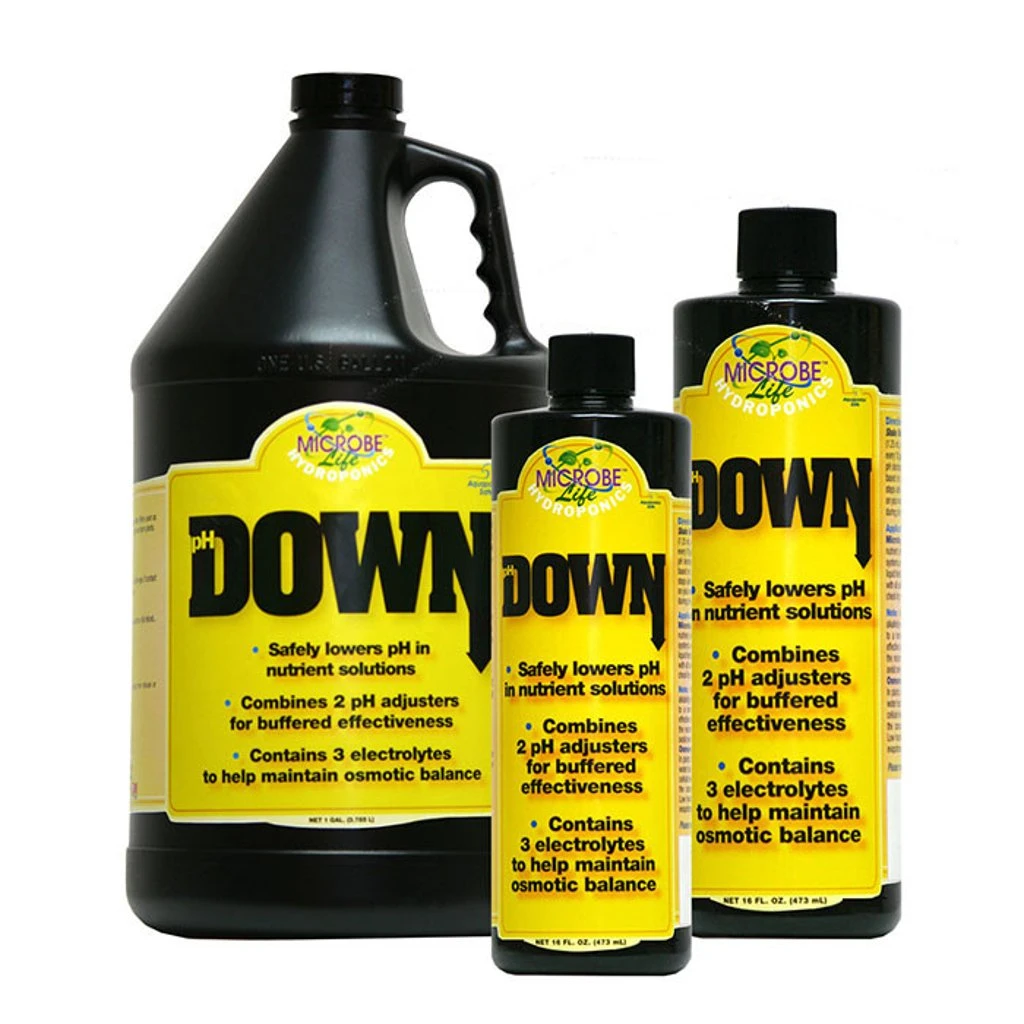 Microbe Life Hydroponics pH DOWN is formulated with R/O and UV sterilized water and combines two pH adjusters for buffered effectiveness. It contains three electrolytes to help maintain osmotic balance.