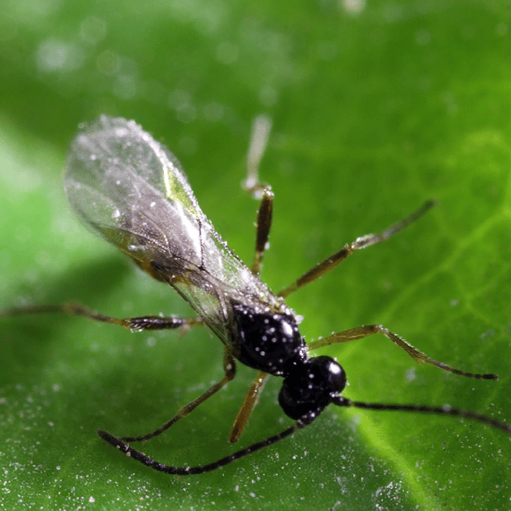 Used mostly in greenhouses producing vegetables and ornamentals. Adult wasps are black 4-5 mm long. Adult females lay eggs from their abdomen by quickly curling their abdomen and puncturing an aphid simultaneously with its ovipositor. The egg once inside the aphid will hatch into a larva and consumes the aphid. The larvae when fully grown will cut a slit in the carcass and attaches it to a fixed object. The larvae then pupates (spins a cocoon) inside the dead aphid. The mummified aphid swells into a characteristic round, golden brown mummy. The emerging adult will cut a symmetrical hole at the bottom end to escape from the mummified aphid.