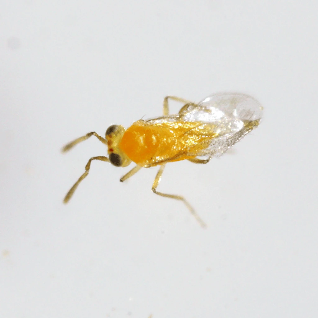 Eretmocerus is a tiny 1/50th inch, goldish colored, native, flying wasp that does not bite or sting. Works well in hot dry climates. Eretmocerus lay their eggs under the nymphs of whiteflies. The larvae hatch out and eat the whitefly. Eretmocerus females also eat immature whitefly as a food source. Each female can make 50 – 150 wasps.