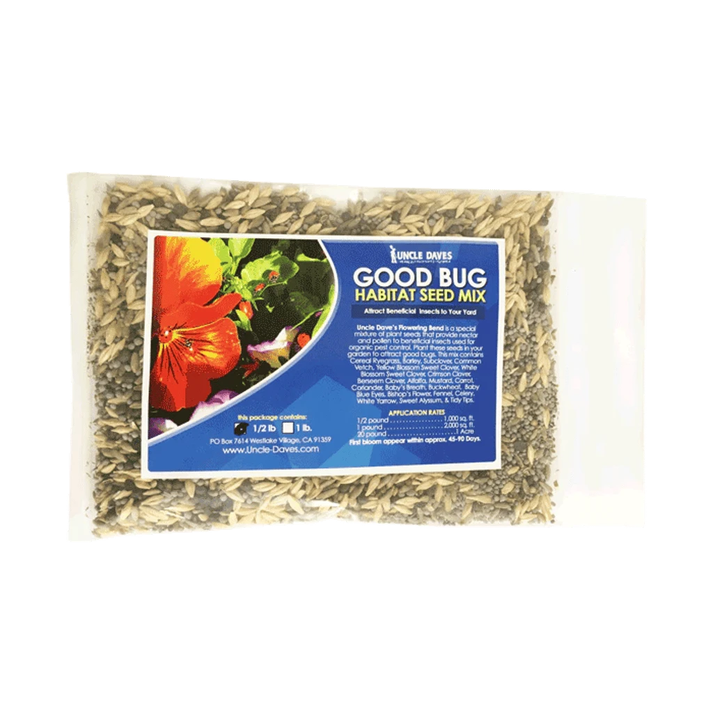 Uncle Dave’s Flowering Blend is a special mixture of plant seeds that provide nectar and pollen to beneficial insects used for organic pest control. Plant these seeds in your garden to attract good bugs. This mix contains. Cereal Ryegrass, Barley, Subclover, Common Vetch, Yellow Blossom Sweet Clover, Crimson Clover, Berseem Clover, Alfalfa, Mustard, Carrot, Coriander, Baby’s Breath, Buckwheat, Baby Blue Eyes, Bishop’s Flower, Fennel, Celery, White Yarrow, Sweet Alyssum & Tidy Tips.