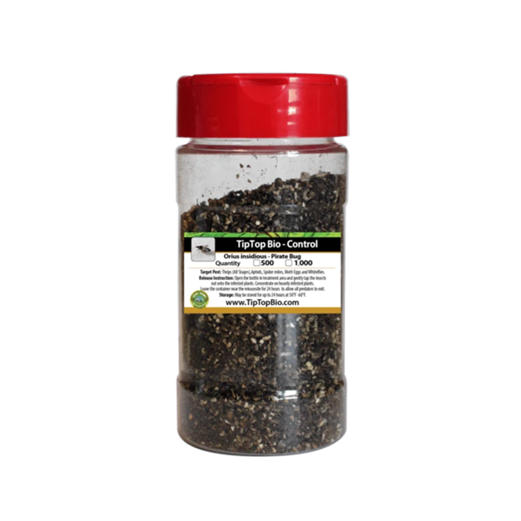 Orius insidiosus – Minute Pirate Bug – attacks Adult Thrips, are general predators, feeding on many pest species. Primarily used to control all stages of Thrips. Adults kill as many as 80 pests per day. Without pests to eat, Orius will feed on pollen. Multiple releases are recommended because it takes 4-6 weeks to establish a colony. Adults are tiny flying insects (3mm). Females can lay up to 3 eggs per day. Nymphs go through 5 instars before adult. All stages are predatory. Orius may enter into diapause (hibernation) when day light is less than 12 hours. In most cases Artificial Grow lights will keep the Orius from going into hibernation during the winter months. florescent lights will work as well.