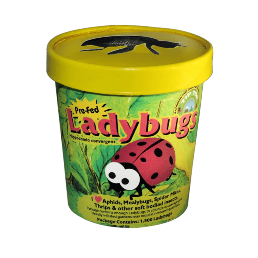 Convergent ladybird beetles (Hippodamia convergens) are shipped as adults in containers and cloth bags. Storing the beetles can be done at a temperature of 40°F to 60°F for 1 – 3 weeks. Ideally ladybugs should be released in the evening or very early morning when it is cool or overcast so they move more slowly. To improve performance, mist foliage beforehand. Ladybug beetles can begin reproducing immediately with ample food and moisture. Several generations may occur during one season.