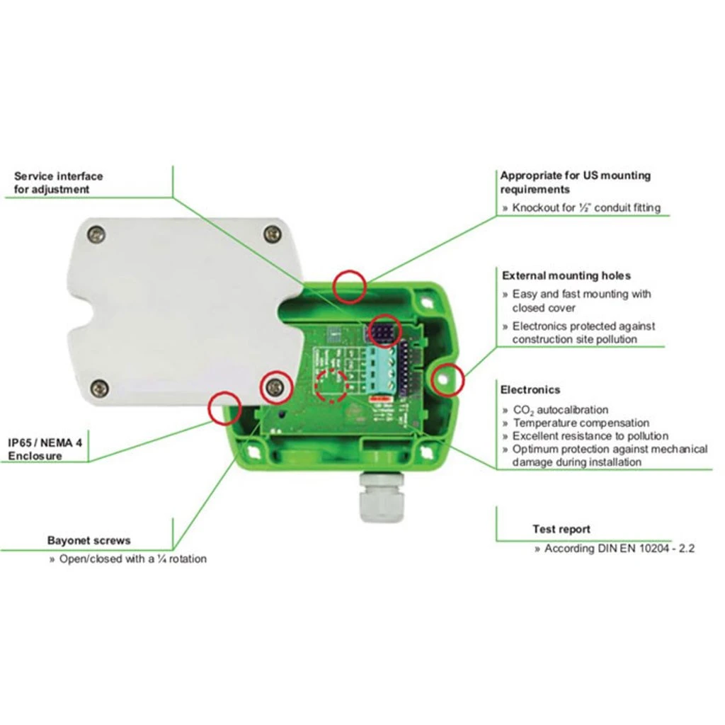 The 080-EVC4 incorporates a dual wavelength NDIR CO2 sensor, which compensates for ageing effects, is highly insensitive to pollution and offers outstanding long term stability. The RH sensing element is protected against dust, dirt and corrosion.